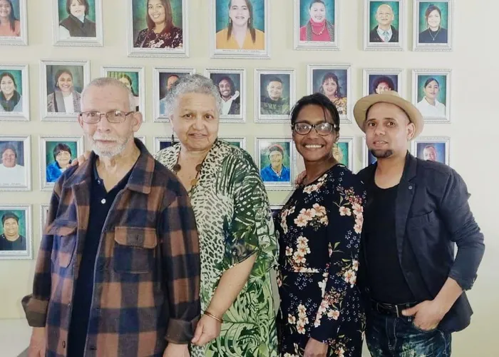 From left are Ralph Sedras, with his wife, Suidooster actress Theresa, Shamiega Charity, Levana Primary School principal, and actor Bradley Williams.