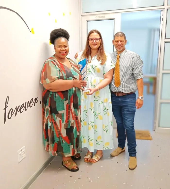 In the middle is Nicolene Langner, with her Sports Coach of the Year award, with school principal, Nomaxabiso Ndidi-Lewo, on the left, and Deputy Principal, Kevin Soekers on the right.