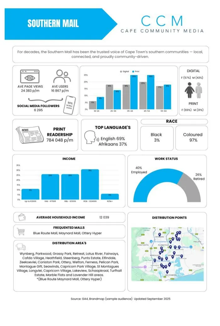 The Southern Mail is a free weekly community newspaper available in print and digital format, and is distributed to 50 510 readers’ homes every Wednesday in the Wynberg, Parkwood, Grassy Park, Retreat, Lotus River, Fairways, Cafdo Village, Heathfield, Steenberg, Punts Estate, Elfindale, Zeekoeivlei, Coniston Park, Ottery, Wetton, Ferness, Pelican Park, Montague Gift, Seawinds, Capricorn Park Village, St Montagues Village, Longvlei, Capricorn Village, Lakeview, Schaopkraal, Turfhall Estate, Marble Flats and Lavender Hill areas.