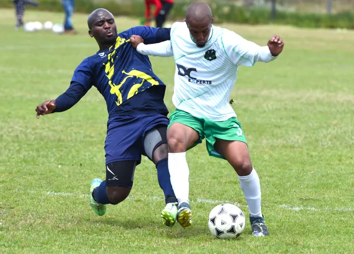 Montague Spurs' Tasreeq Fielies, right, and a player from PSV Quemic battle for possession during their Safa Cape Town Third Division Play-offs in Grassy Park on Sunday.