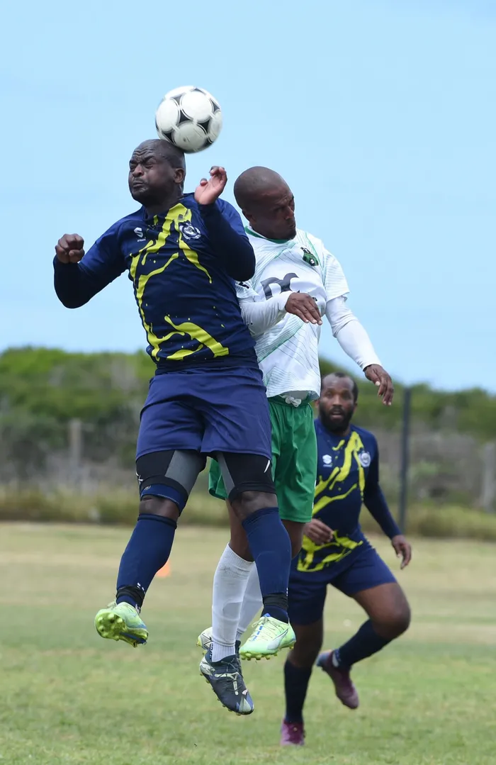 Kogi Malikhiwe of PSV Quemic, left, heads the ball away from his Montague Spurs opponent, during their Safa Cape Town Third Division Play-offs in Grassy Park, on Sunday.