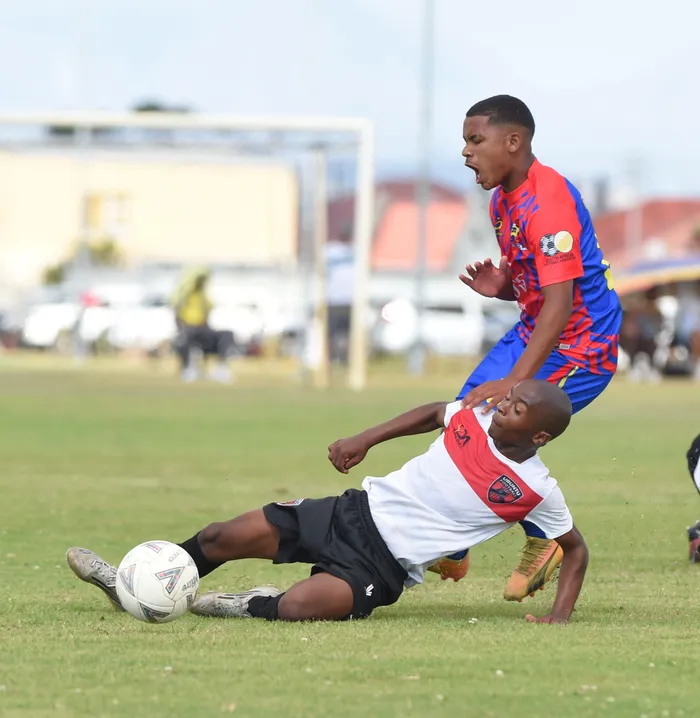 Ubuntu's Siyasamkela Ngumba slides into a tackle on FN Rangers' Wahied Wilkenson, during their sides' ABC Motsepe League match, at the Royal Road sports ground, on Saturday.
