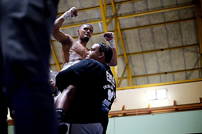 Mika-Eel Jacobs hoisted shoulder high follwong his win against Gift Bholo, at last Friday's Battle in the Plains 2.