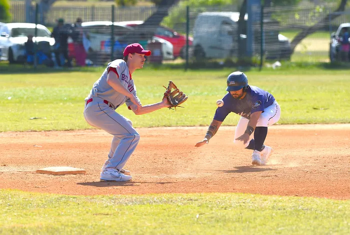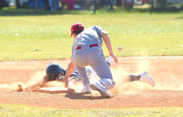 Luke November of VOB attempts to tag Bellville's Marchel Steyn, at third base during their sides' Cape Town Major League baseball match at Chukker Road at the weekend.